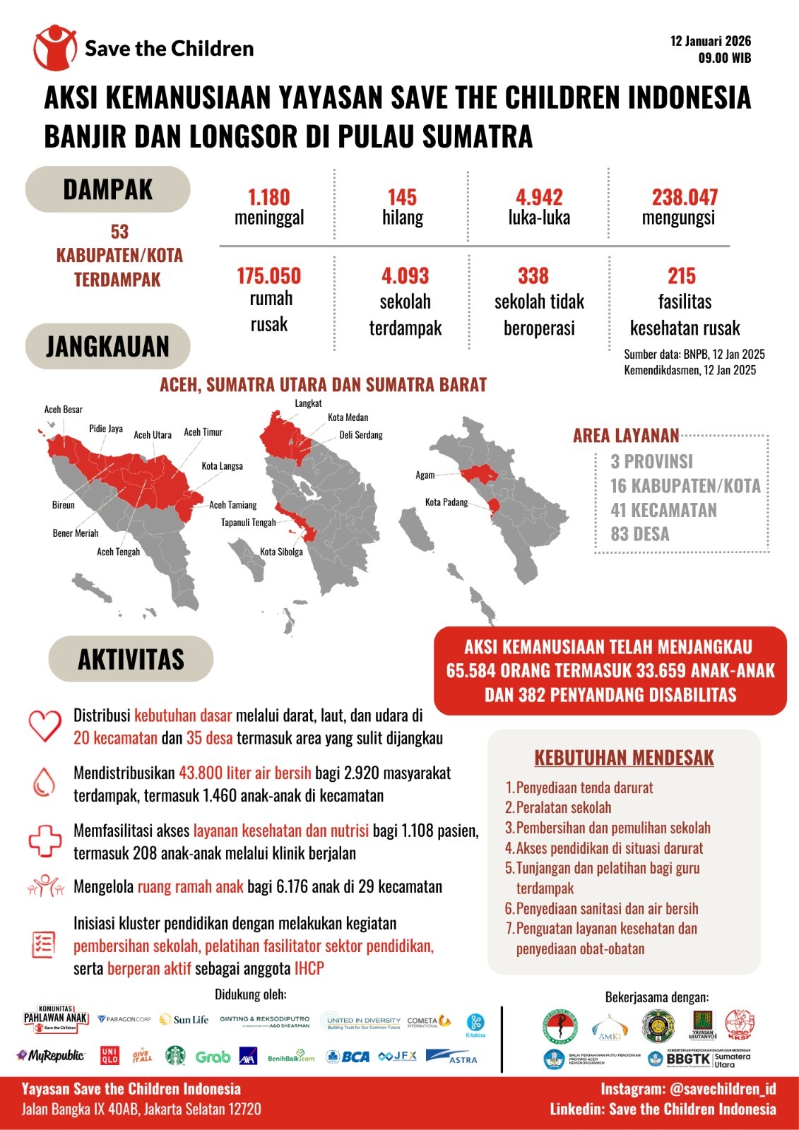 Data laporan tahun 2025 yang tercatat secara resmi oleh Save The Children Indonesia, terutama penanganan pada anak terdampak banjir di Aceh, Sumatera Utara dan Sumatera Barat.