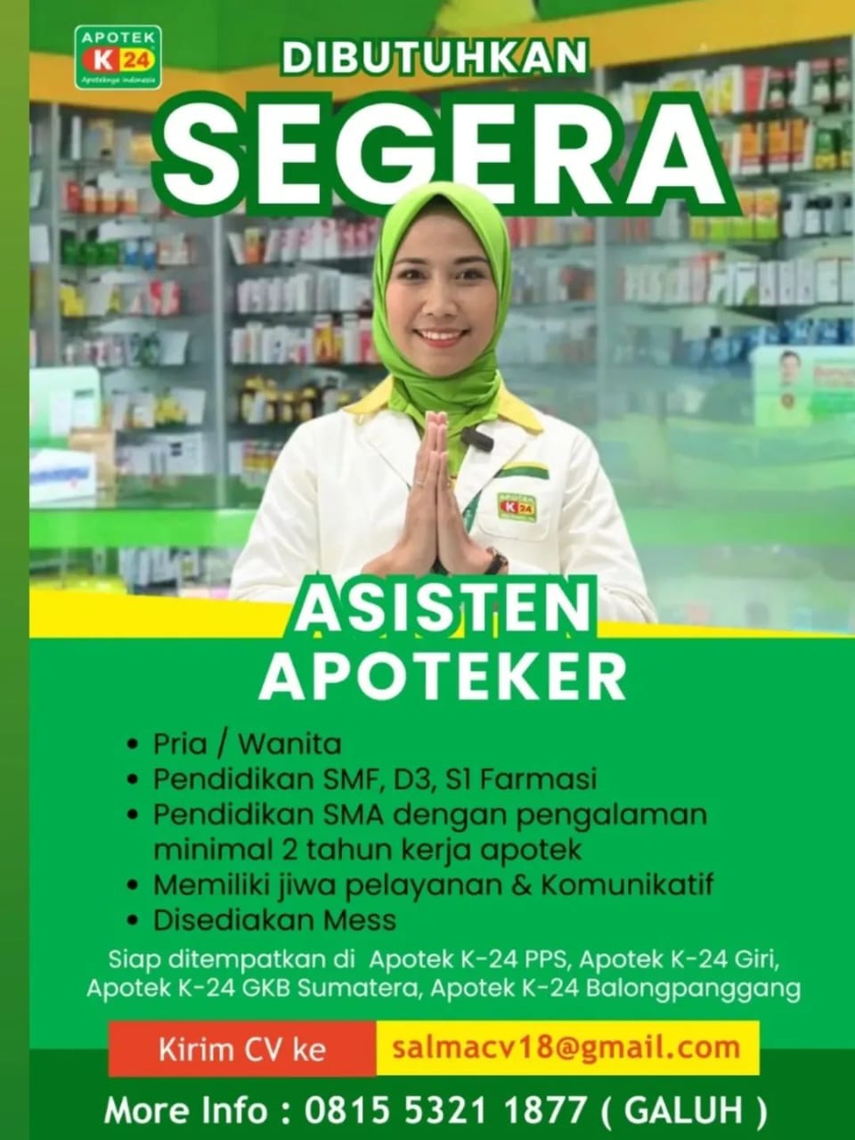 Disclaimer: Informasi lowongan ini bersumber dari materi promosi resmi Apotek K-24. Pelamar disarankan melakukan verifikasi langsung kepada pihak perusahaan untuk memastikan kebenaran detail lowongan sebelum mengirimkan berkas lamaran.