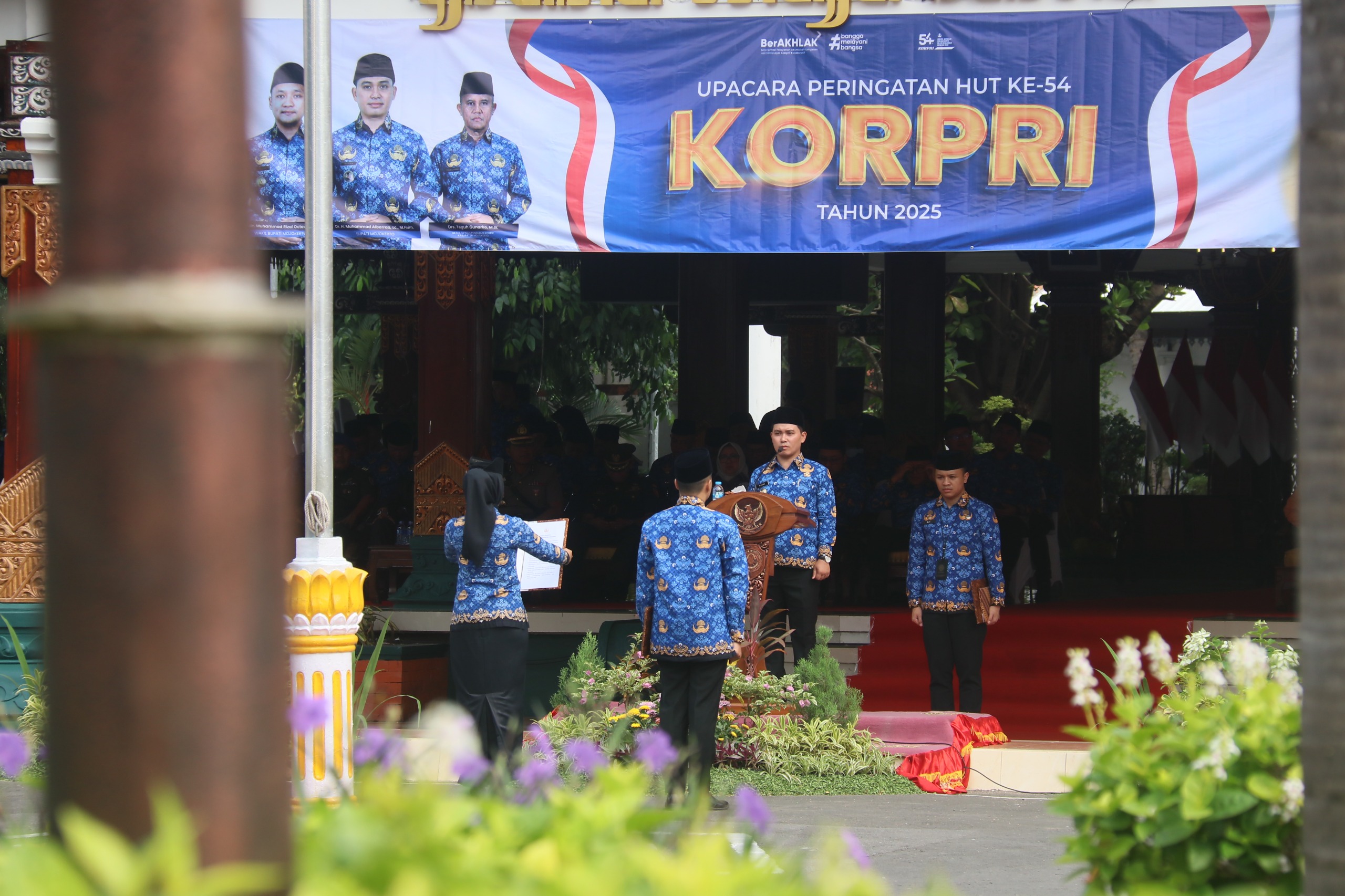Infomojokerto.id – Bupati Mojokerto, Muhammad Albarraa, menyerahkan 26 piagam penghargaan dan 73 sertifikat tanah aset Pemerintah Kabupaten Mojokerto dalam Upacara Peringatan Hari Ulang Tahun (HUT) Korps Pegawai Republik Indonesia (Korpri) ke-54 pada Senin (1/12) pagi.